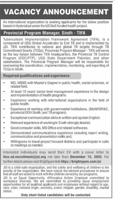 Candidates if you are seeking the An International Organization Jobs In Islamabad December 2025 if yes. It would be best if you tried to complete read this An International Organizationjob because you can easily apply for these vacancies Provincial Program Manager, Sindh – TIFA Only male candidates can apply for this An International Organization Jobs In Islamabad December 2025 Qualification /Experience Required:MD, MBBS with Master’s Degree in public health, social sciences, or related field At least 10 years’ senior-level management experience in the design and implementation of health programs, and more experienced candidates should apply before 15 December 2025.