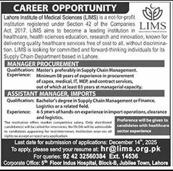 Candidates if you are seeking the Lahore Institute Of Medical Science Jobs In Lahore December 2025 if yes. It would be best if you tried to complete read this Lahore Institute Of Medical Science job because you can easily apply for these vacancies ASSISTANT MANAGER, IMPORTS Only male candidates can apply for this Lahore Institute Of Medical Science Jobs In Lahore December 2025 Qualification /Experience Required:Master’s preferably in Supply Chain Management. Minimum 08 years of experience in procurement of capex, medical, IT, MEP, and contract services, out of which at least 03 years at managerial capacity, and more experienced candidates should apply before 25 December2025.