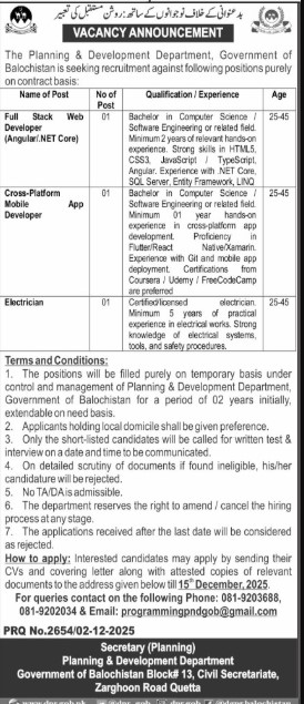 Planning And Development Department jobs In Balochistan, December 2025 Advertisement