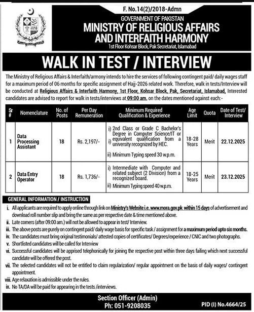 Candidates if you are seeking Religious Affairs And Interfaith Harmony Jobs In Islamabad December 2025 if yes. It would be best if you tried to complete the Religious Affairs And Interfaith Harmony job because you can easily apply for these vacancies Data Processing Assistant, Data Entry Operator.