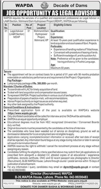 Only male candidates can apply for this Wapda Decade Of Dams Jobs In Karachi December 2025 Qualification /Experience Required: (LLB or equivalent) from a recognized institution (LLB or equivalent) from a recognized institution. Excellent written and verbal communication skills Ability to work collaboratively in a team environment. Proficiency in MS Office and legal research tools. Aminimum CGPA of 3.00 out of 4.00 or 4.00 out of 5.00 or 80% marks (for local graduates) and 65% marks (for foreign graduates) is a requisite for the degree on which the candidate may apply and such degree shall not be issued later than three (3) years from the date of advertisement Fresh Graduates from reputable universities are encouraged to apply, and more experienced candidates should apply before 25 December 2025.
